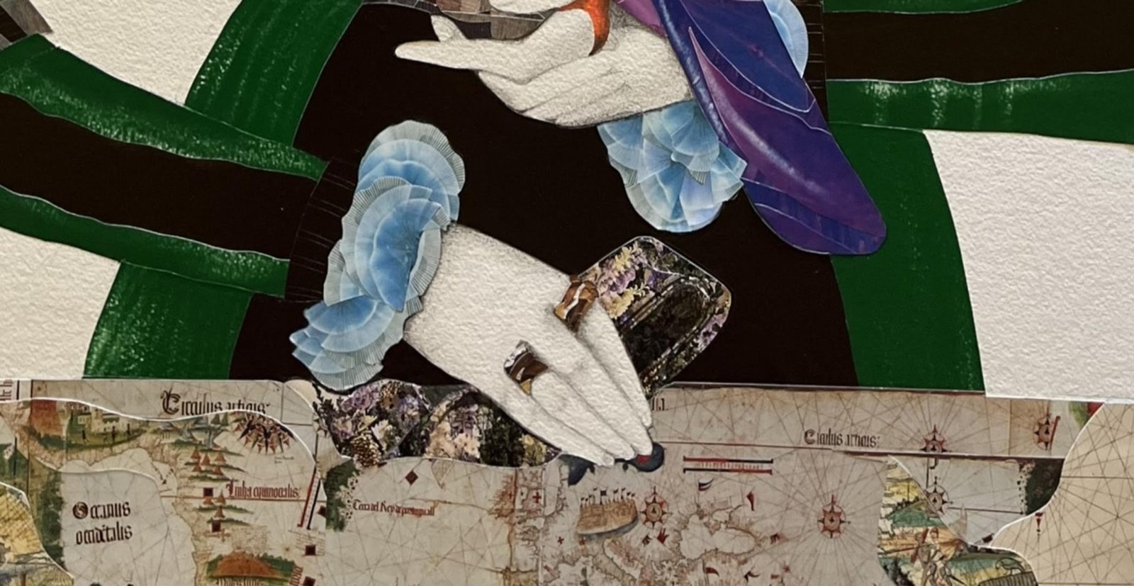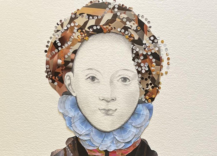 Aquí se puede observar la calidad del papel y su grosor; junto con el meticuloso trabajo de dibujo y collage, con cuello isabelino en varias capas.